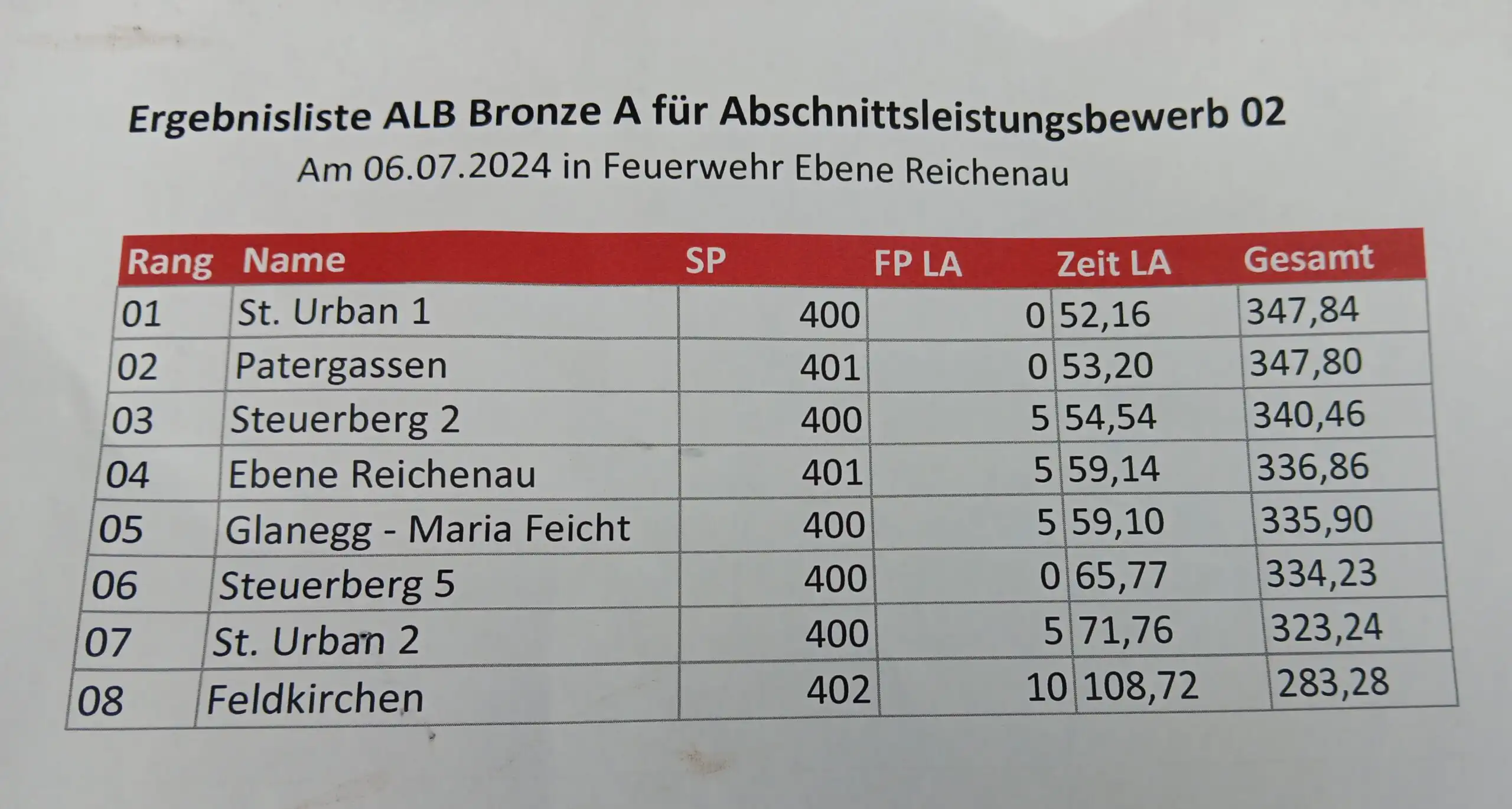 Am Samstag den 06.07.2024 fanden in Ebene Reichenau zwei der vier Abschnittsleistungsbewerbe im Bezirk Feldkirchen statt. Mit am Start auch die 5. Gruppe der Freiwilligen Feuerwehr Patergassen. Am Vormittag konnten sie sich mit einem fehlerfreien Löschangriff den ersten Sieg sichern. Obwohl auch am Nachmittag der Löschangriff fehlerfrei absolviert werden konnte, reichte es um 0,04 Sekunden nicht zum zweiten Sieg. Nichts desto trotz waren sie mit ihrer Leistung hoch zufrieden.