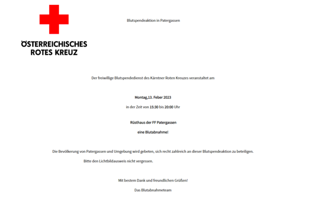 Jahreshauptversammlung der Freiwilligen Feuerwehr Patergassen Am Donnerstag den 05.01.2023 fand die Jahreshauptversammlung der Freiwilligen Feuerwehr Patergassen im Kameradschaftsraum des Rüsthauses statt. Nach Eröffnung der Jahreshauptversammlung begrüßte der Kommandant OBI Andreas Foditsch alle anwesenden Kameradinnen und Kameraden und die Ehrengäste Bezirksfeuerwehrkommandant OBR Konrad Ludwig ; Abschnittsfeuerwehrkommandant ABI Puggl Werner und Bürgermeister Karl Lessiak. Dannach erhebten wir…