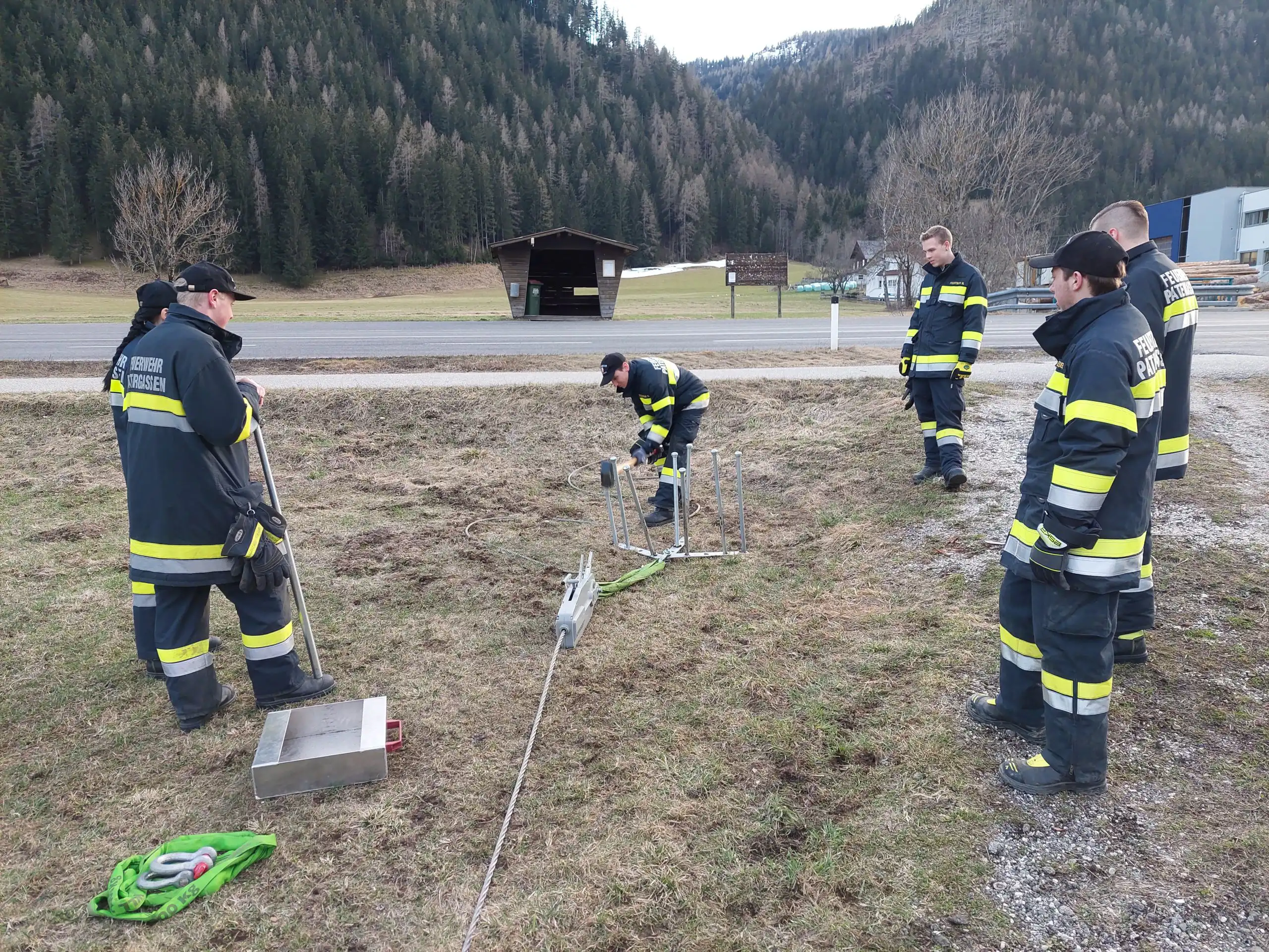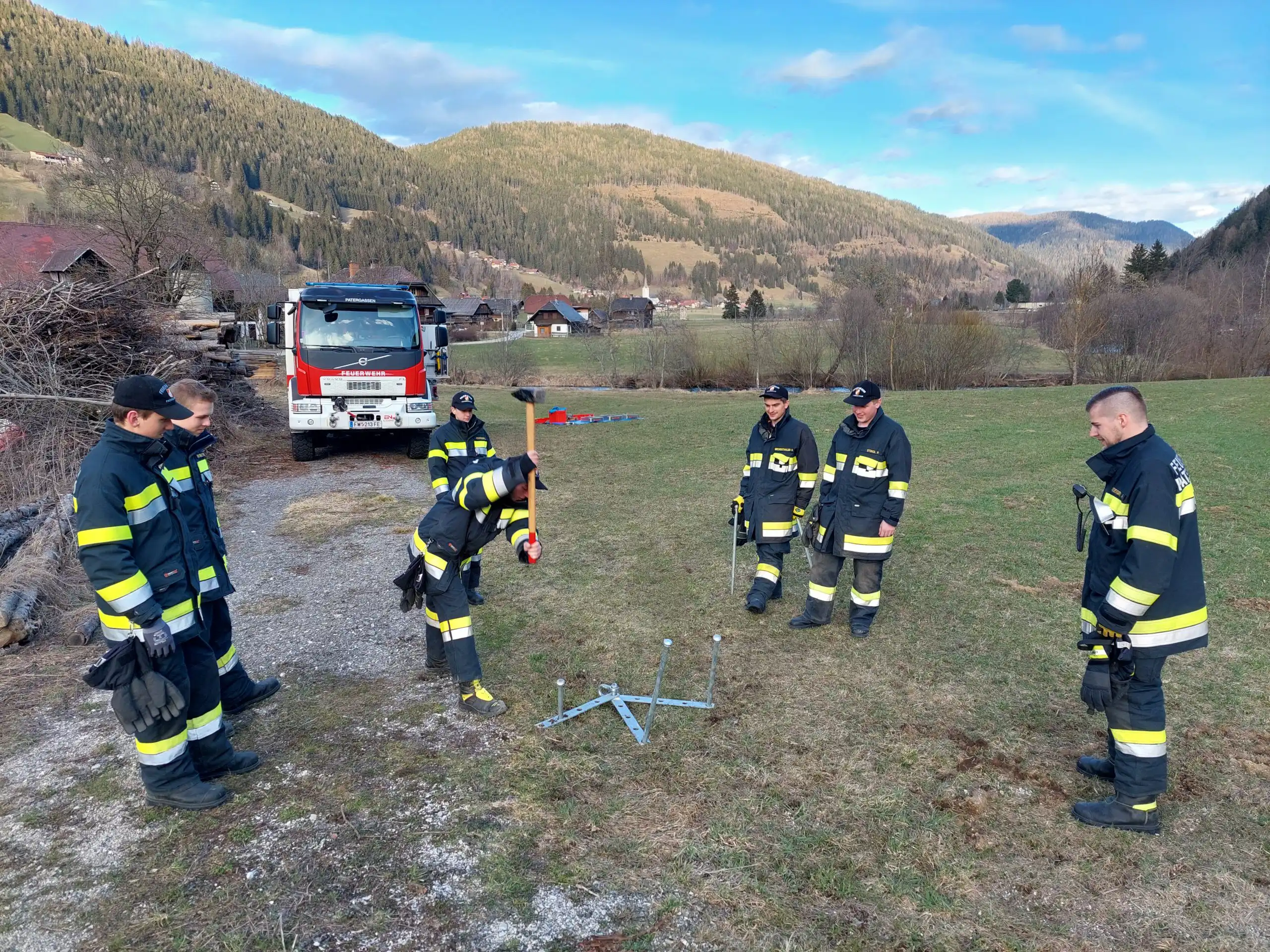 Kraftfahrer und Maschinist V Possegger Alexander erklärte kurz den Umgang mit den Greifzug und der Freilandverankerung. Danach wurde die Freilandverankerung nur mit 3 Erdnägel gegen die Zugrichtung befestigt um zu veranschaulichen wie sich die Nägel bei Zug hier verhalten.