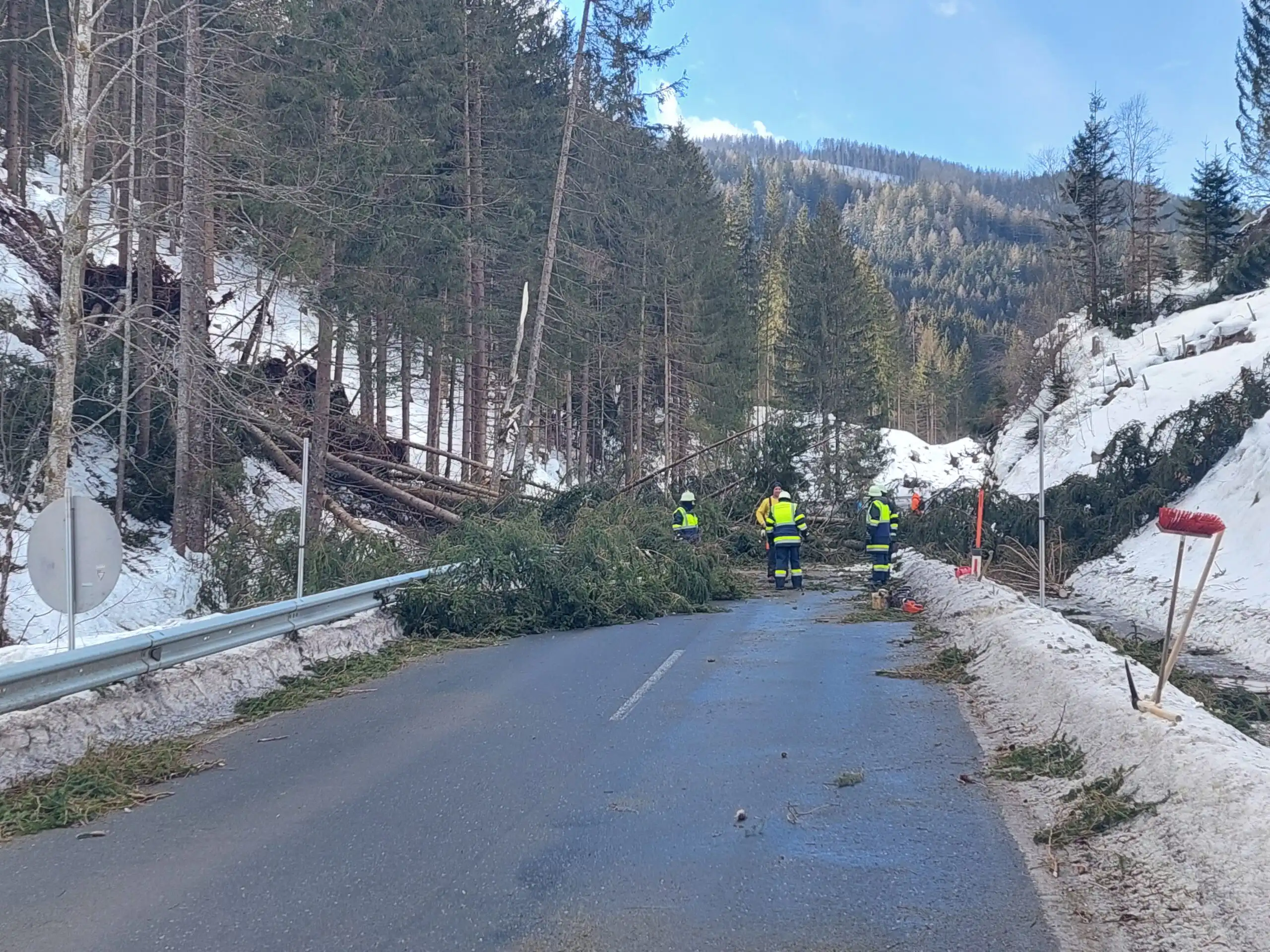 Am Samstag den 04.02.2023 wurden die Kameraden der Freiwilligen Feuerwehr Patergassen per Sirenenalarm zu einem Unwettereinsatz gerufen. Wie auch in weiten Teilen Kärntens brachte der böige, sturmartige Wind im Bereich der B88 zwischen Patergassen und Bad Kleinkirchheim, im sogenannten Mühlgraben wieder Bäume zum umstürzen und blockierten somit die Straße. Sofort wurde mit den Aufräumarbeiten begonnen. Feuerwehrkamerad Michenthaler Hannes vlg. Matl unterstütze uns mit seinem Traktor mit aufgebauter Seilwinde und Frontlader. Des Weiteren bekamen wir Unterstützung von Knallnig Gerhard, von uns Gerry genannt mit seinen Holztransporter der Fa. WeissTrans aus Himmelberg.