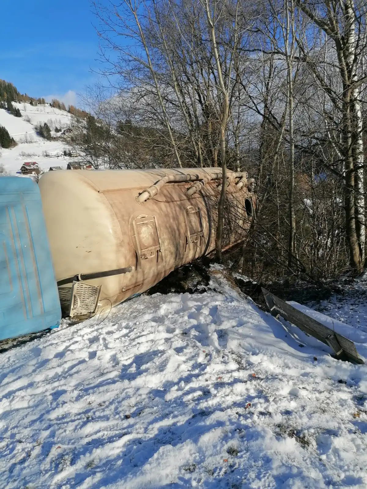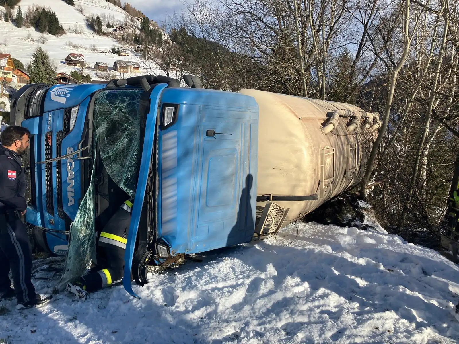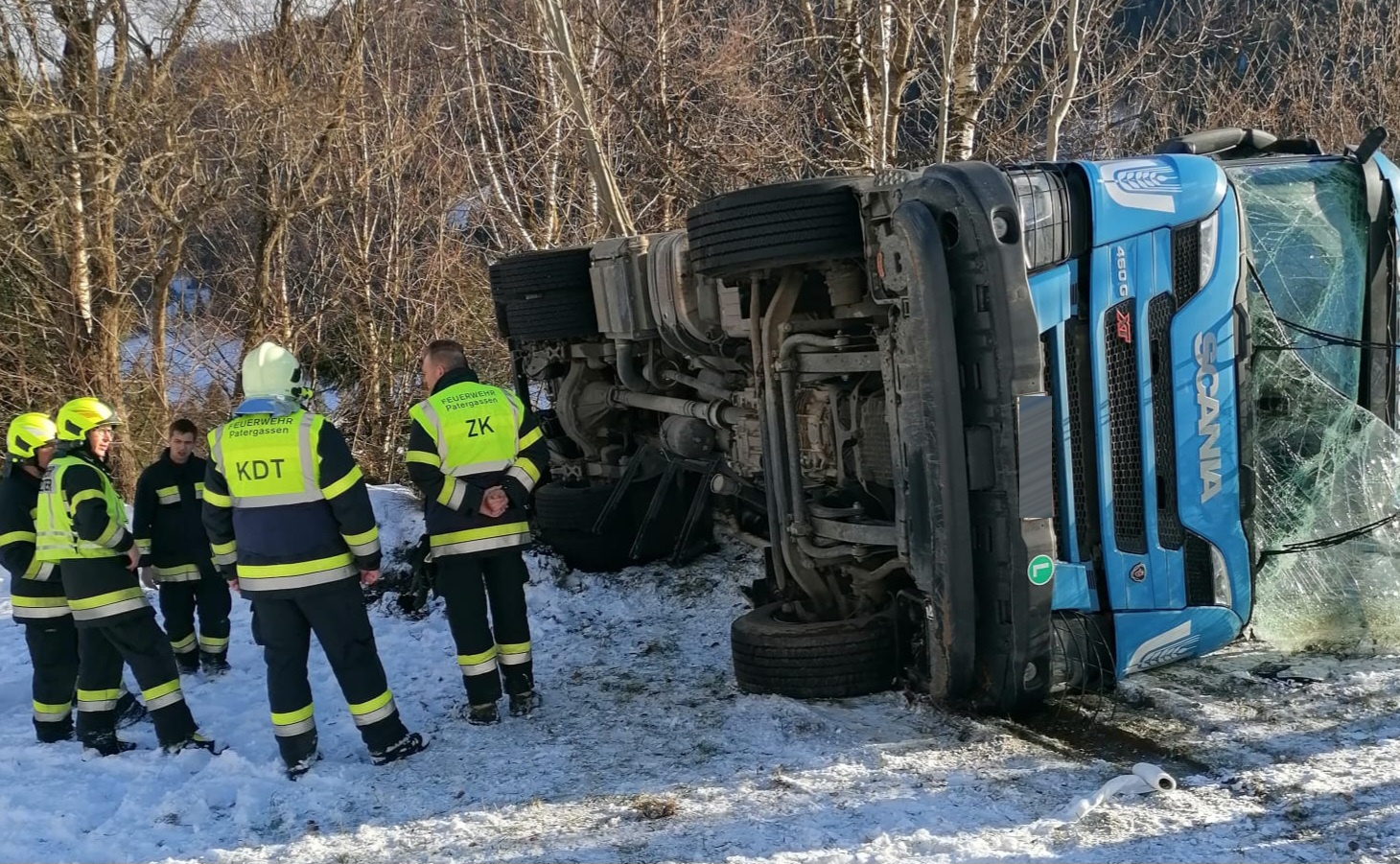 Am Einsatzort angekommen ergab sich für die Einsatzkräfte folgendes Bild. Ein mit Futtermittel beladener LKW kam von der Fahrbahn ab, kippte auf die Seite und rutschte anschließend einen steilen Abhang hinunter. Nach ca.70m kam er auf einen flacheren Stelle bei einem Misthaufen und mehreren Bäumen zum Stillstand. Der Fahrer konnte sich laut ersten Informationen selbstständig aus dem Fahrzeug befreien. Er wurde nach der Erstversorgung von der Johanniter Unfallhilfe Patergassen in das Krankenhaus gebracht.