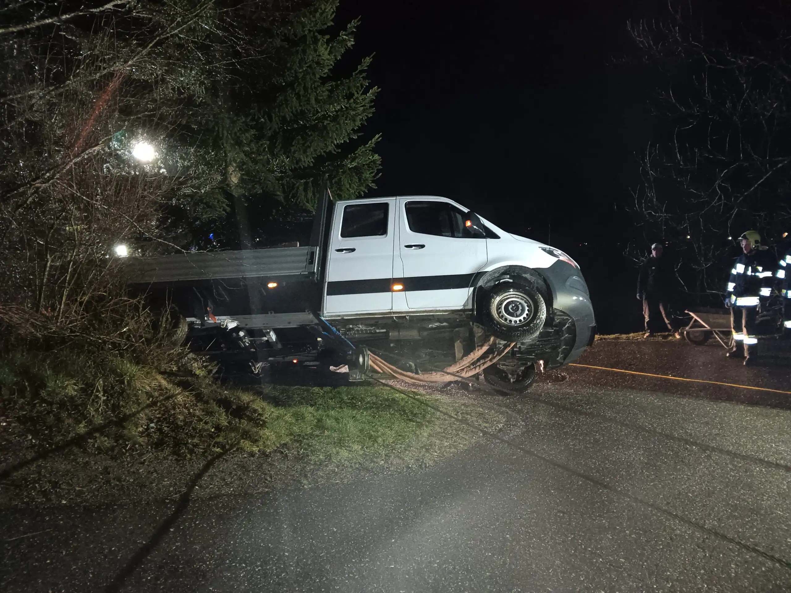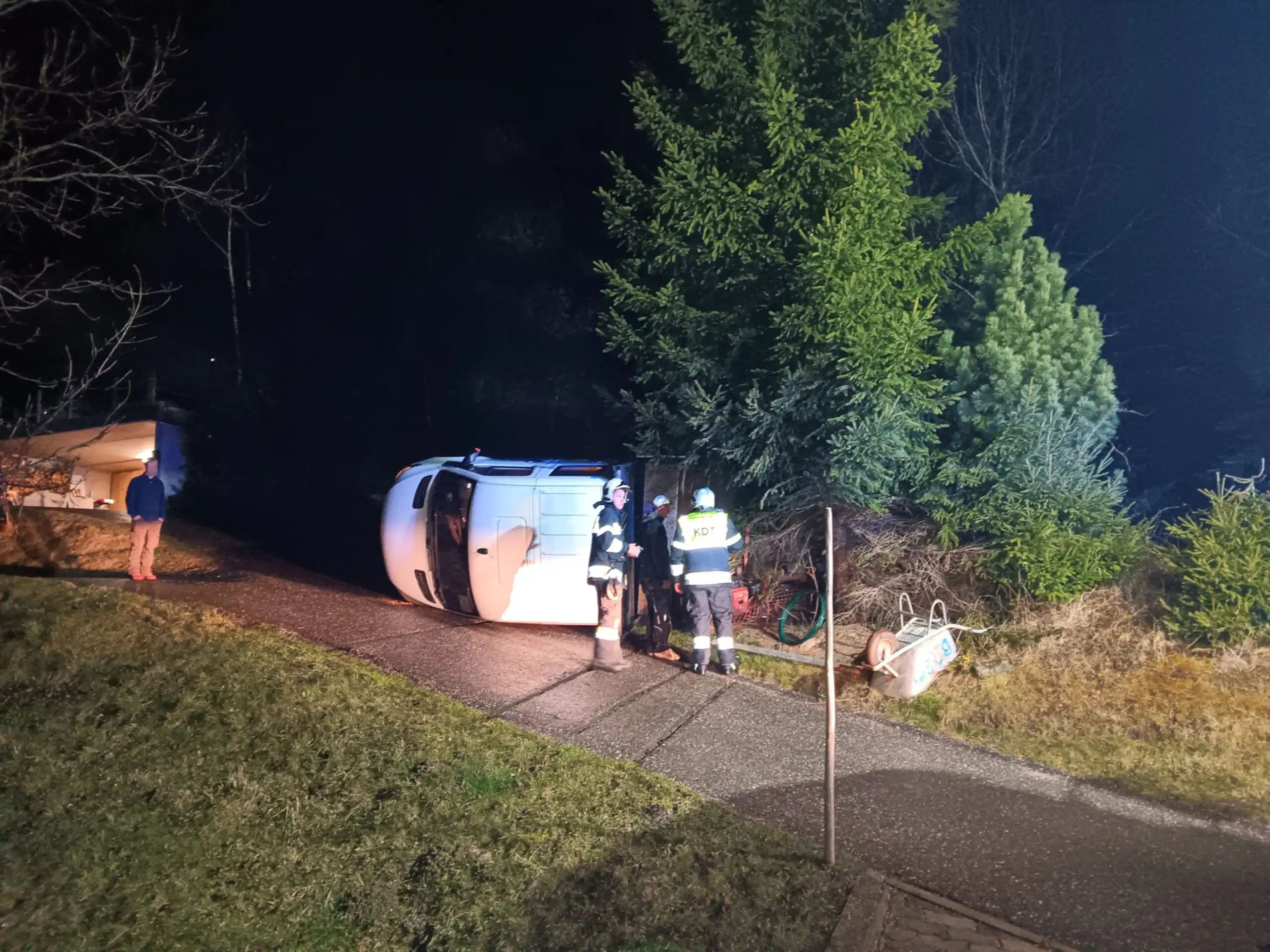 Am Einsatzort angekommen ergab sich folgendes Bild: Obwohl bei einem Fahrzeug die Handbremse angezogen war, setzte sich dieses rückwärts in Bewegung und kippte auf einer kleinen Böschung um.