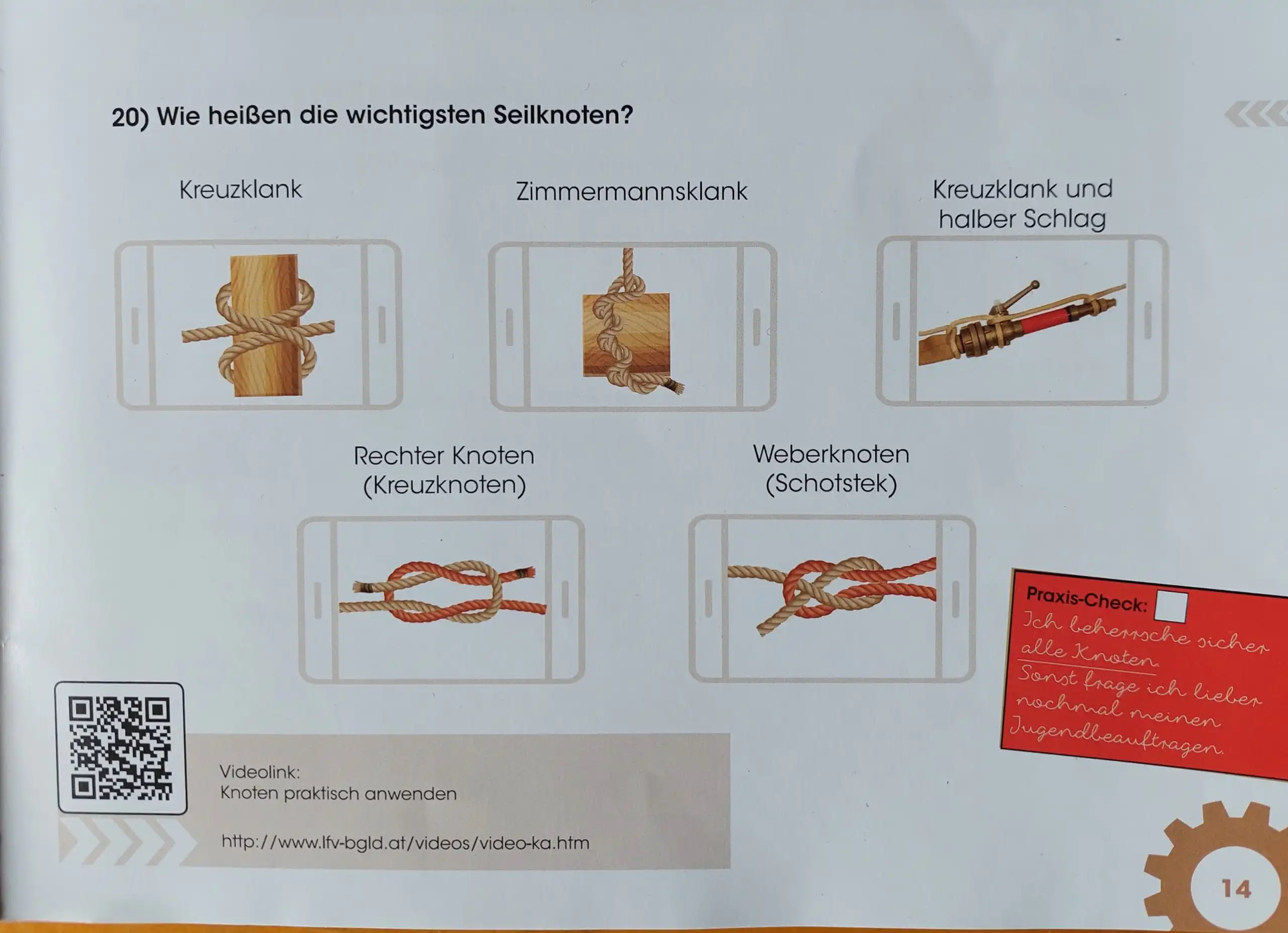Bei dieser Übung wurden folgende Knoten beübt: Kreuzklank; Zimmermannsklank; Kreuzklank und halber Schlag; Rechter Knoten und Weberknoten.