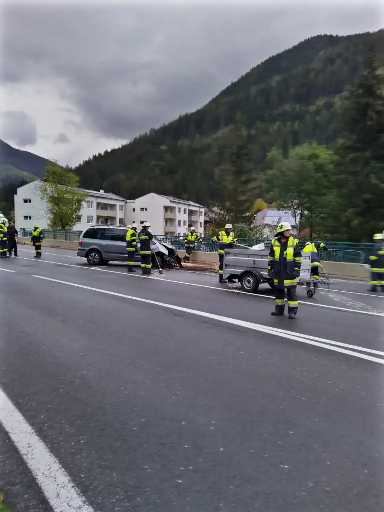 Das Fahrzeug samt Anhänger wurden zurück auf die Fahrbahn geschleudert und kamen entgegen der Fahrtrichtung zu liegen.