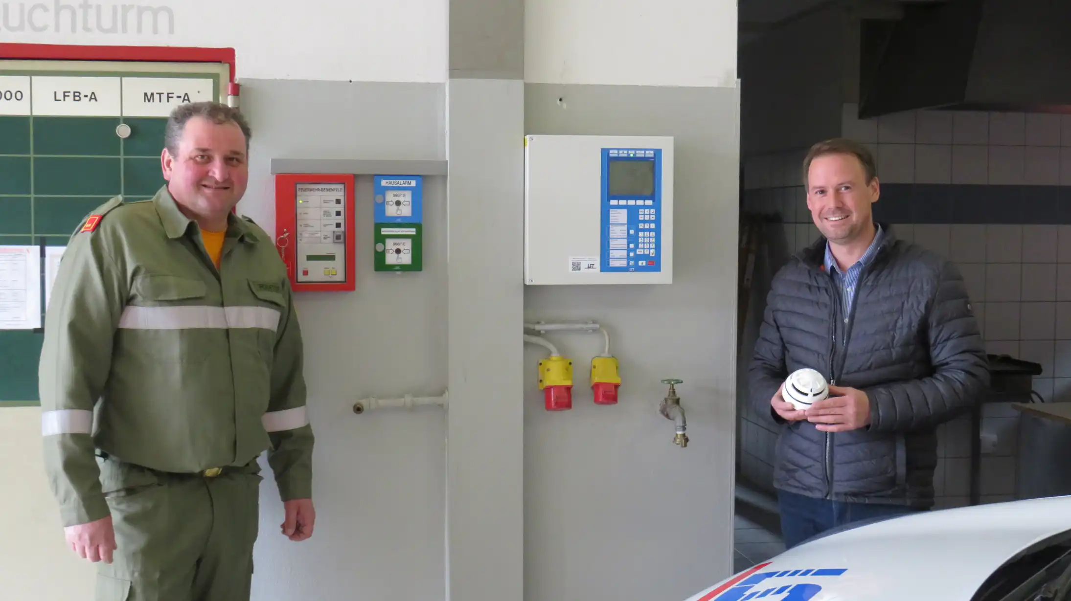 Der Kommandant der Freiwilligen Feuerwehr bedankt sich im Namen der Kameradschaft bei Herrn Hubert Warmuth für die Zurverfügungstellung der Brandmeldeanlage.