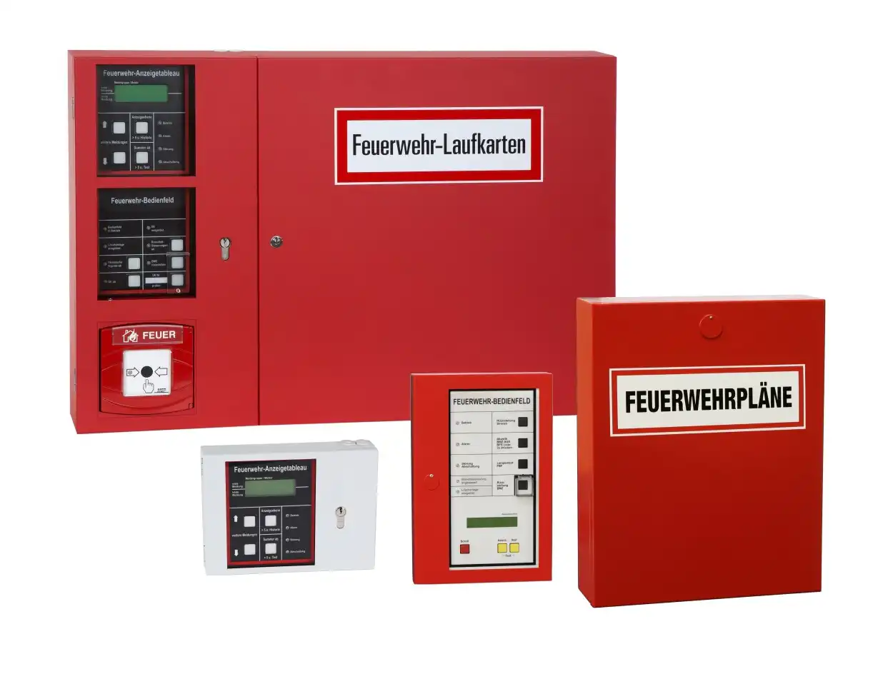 Die Einsatzkräfte können die wesentlichen Systemzustände – etwa Alarm, Störung oder Abschaltung – am genormten Feuerwehr-Bedienfeld ablesen und wichtige Bedienungen vornehmen. Die Brandschutzpläne des Gebäudes können von den Einsatzkräften aus dem Feuerwehr-Plankasten entnommen werden.